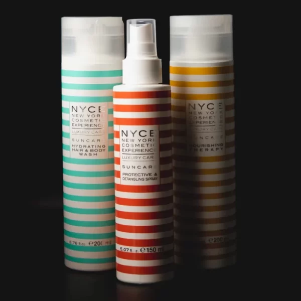 Set produse de vara pentru ingrijirea parului care contine gel de dus, masca de par si spray de par.